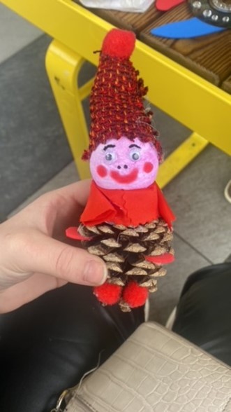 Outils et supports utilisés : Tablier, épingles, aiguille, fils de couture, colle blanche, pistolet à colle, ciseaux, carton, fond de bouteille en plastique, papiers glacés (blanc, rose, vert, jaune), disque CD, néoprène, tissus, bâtonnet, pompons ( brun, rose, rouge), feutrine grise, pince à linge, yeux mobiles, rouleau double face, pelote de laine verte, noix, boules de polystyrènes, pâte Fimo, coquillage, cure-pipe, cure-dents, cône (pomme de pin), pot de crème fraiche, plumes, tissus, perles jaunes et turquoises, paille en plastique.